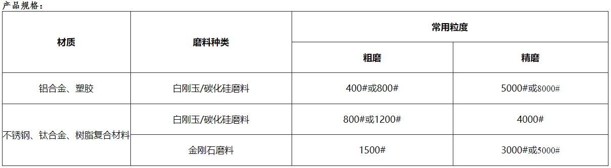 針對不銹鋼、鈦合金、樹脂復合材料,研發了采用金剛石、白剛玉、碳化硅等磨料的金字塔軟膜片,其中金剛石磨料粗磨可以做到1500#,精磨可以做到3000#或5000#。